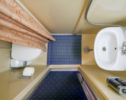 В каюте: четыре спальных места (два внизу, два вторым ярусом), шкаф для одежды, холодильник, фен, радио, душ, санузел, кондиционер, два иллюминатора, электророзетка на 220V.