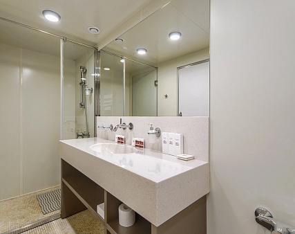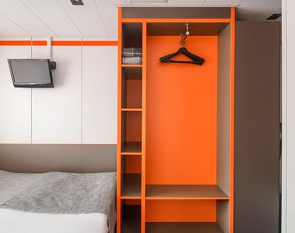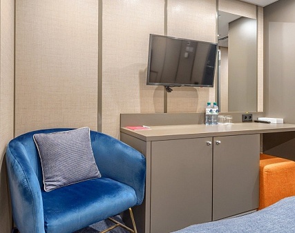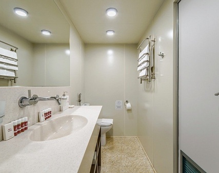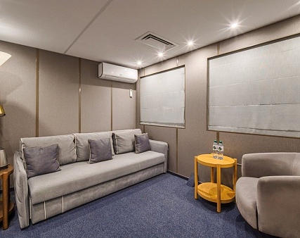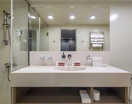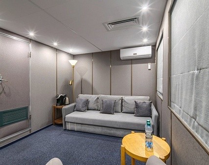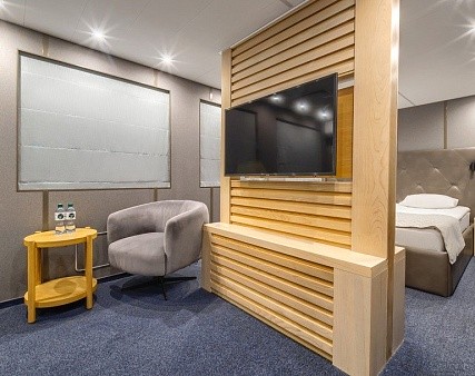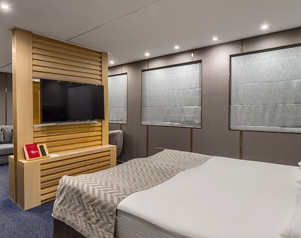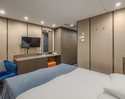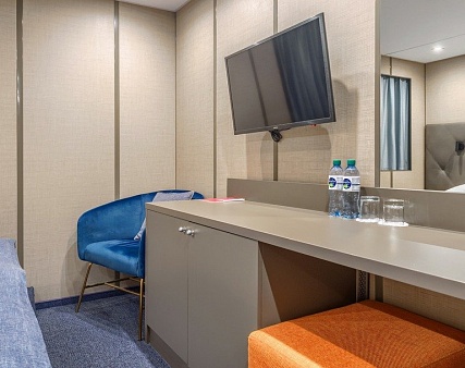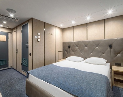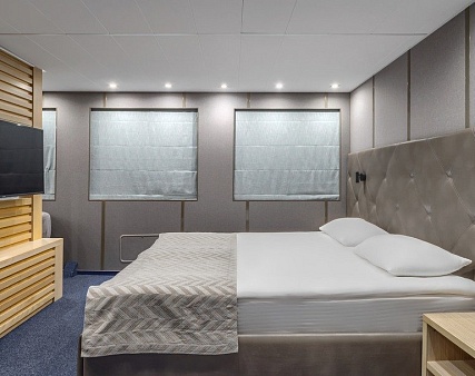В каюте: двуспальная кровать (не раздвигается), кресло, шкаф для одежды, пуфик, сейф, телевизор, холодильник, радио, обзорное окно, душ (душевая штора из водоотталкивающего материала или душевая стеклянная ширма), санузел, кондиционер, фен, электророзетка на 220V.