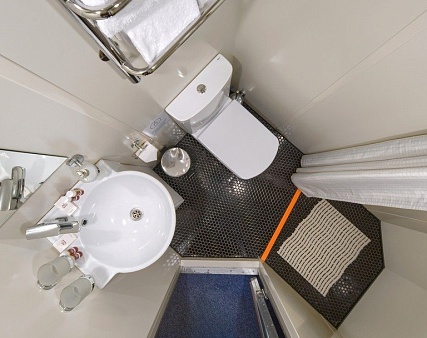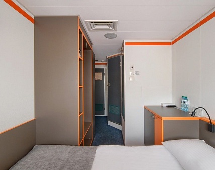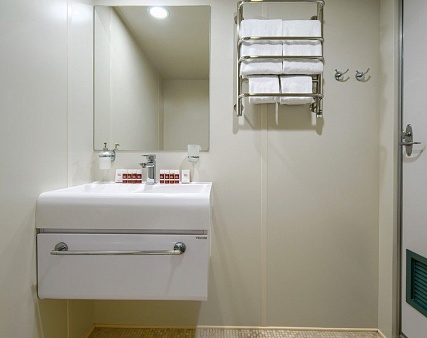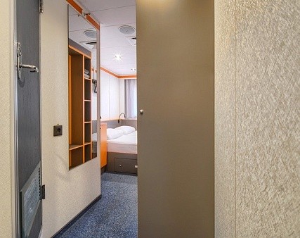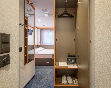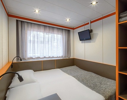 В каюте: одно спальное место, холодильник, сейф, телевизор, шкаф для одежды, радио, душ, санузел, кондиционер, обзорное окно, фен, электророзетка на 220V.