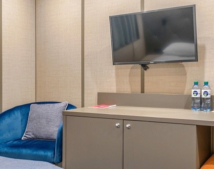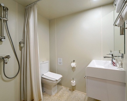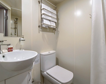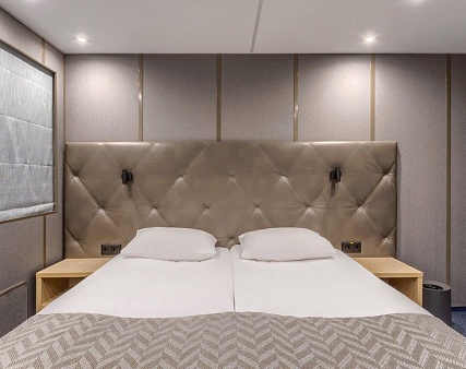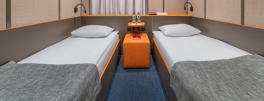 В каюте: две односпальные кровати (не сдвигаются), шкаф для одежды, пуфик, сейф, телевизор, холодильник, радио, обзорное окно, душ (душевая штора из водоотталкивающего материала или душевая стеклянная ширма), санузел, кондиционер, фен, электророзетка на 220V.