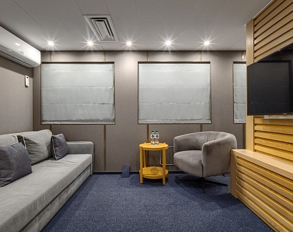 В каюте: двуспальная кровать, диван, кресло, шкаф для одежды, журнальный стол, сейф, телевизор, холодильник, кофемашина, фен, радио, четыре обзорных окна, электророзетка на 220V.