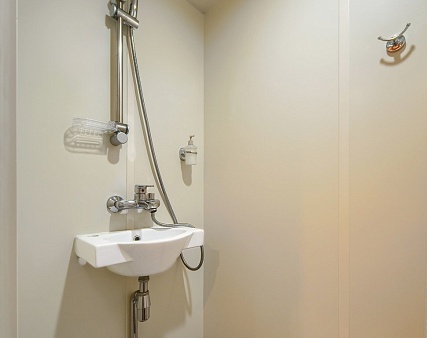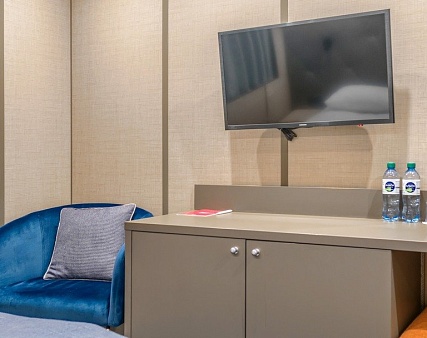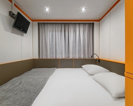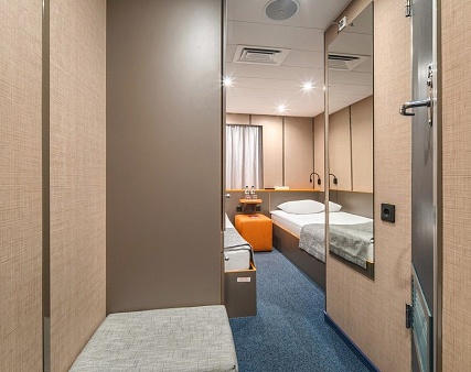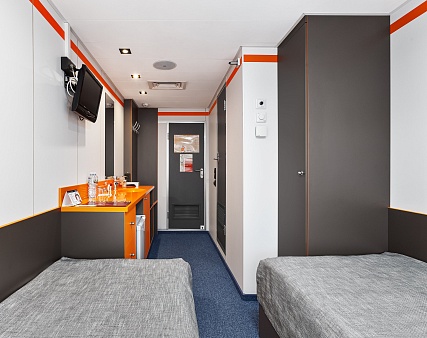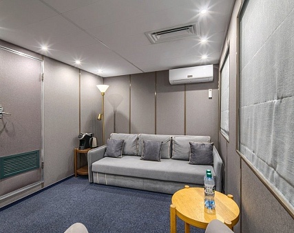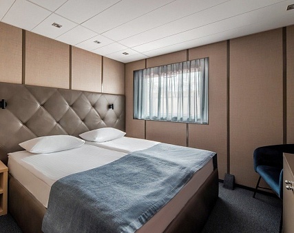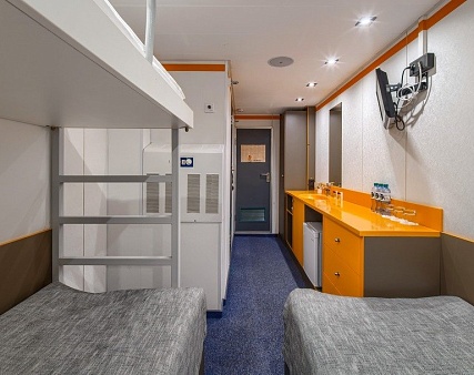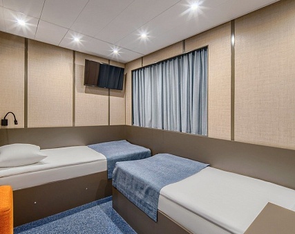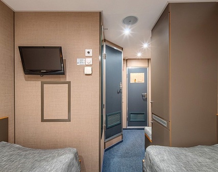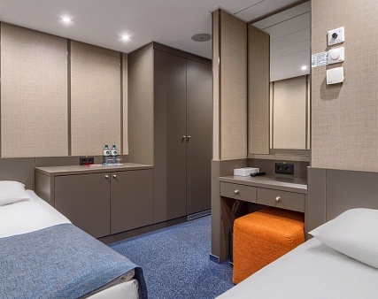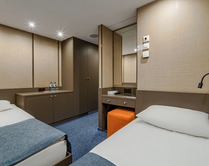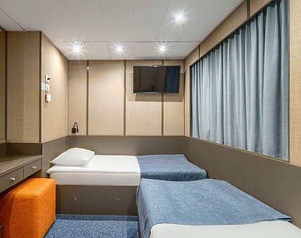 В каюте: две односпальные кровати (не сдвигаются), кресло, шкаф для одежды, пуфик, сейф, телевизор, холодильник, радио, обзорное окно, душ (душевая штора из водоотталкивающего материала или душевая стеклянная ширма), санузел, кондиционер, фен, электророзетка на 220V.