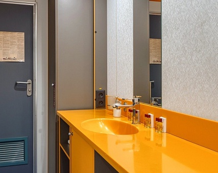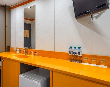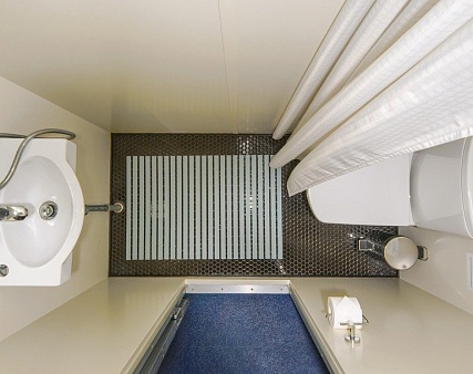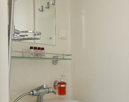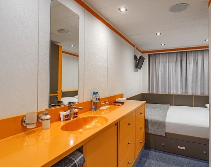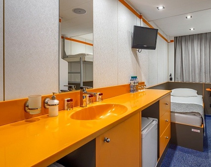 В каюте: две односпальные кровати, холодильник, минибар, сейф, телевизор, шкаф для одежды, радио, обзорное окно, душ, санузел, кондиционер, фен, электророзетка на 220V.