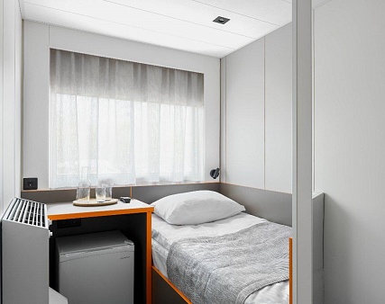 В каюте: одно спальное место, холодильник, минибар, сейф, телевизор, шкаф для одежды, радио, душ, санузел, кондиционер, обзорное окно, фен, электророзетка на 220V.