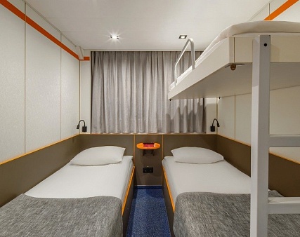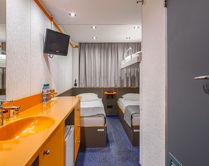В каюте три спальных места (не сдвигаются, верхнее место не складывается), шкаф для одежды, холодильник, минибар, сейф, телевизор, радио, душ, санузел, кондиционер, фен, сейф, два иллюминатора, электророзетка на 220V. Возможна продажа каюты в двухместном одноярусном размещении (по стоимости 2-местной каюты).