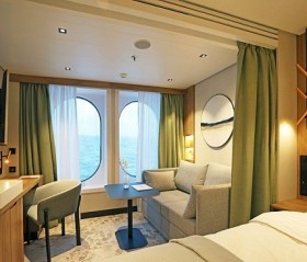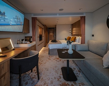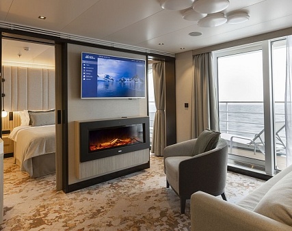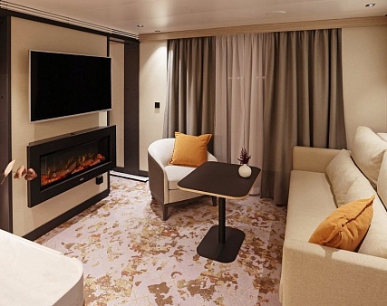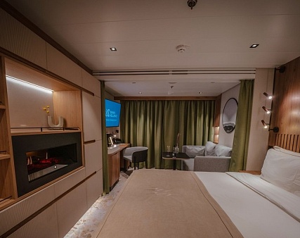 Благодаря наличию панорамного балкона 5 кв.м. каюта всегда наполнена светом. Зона спальни оснащена двуспальной кроватью, конвертируемой в две односпальные по запросу, и оборудована голографическим камином с эффектом живого пламени. Уютная зона гостиной располагает диваном и кофейным столиком. Завтрак на собственном балконе, отдых в зоне гостиной после насыщенного дня или послеобеденный сон – комфортное зонирование каюты позволяет гостям следовать собственным биологическим часам и не зависеть от планов своего спутника. Элегантная ванная комната оснащена душевой кабиной.