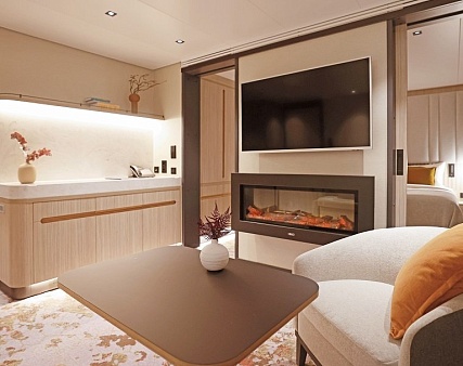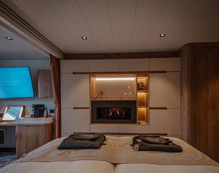 Интерьер каюты с видом на океан выполнен в светлых тонах с использованием натуральных материалов, создавая атмосферу уюта и комфорта. Зона спальни оснащена двуспальной кроватью, конвертируемой в две односпальные (по запросу) и оборудована голографическим камином с эффектом живого пламени.