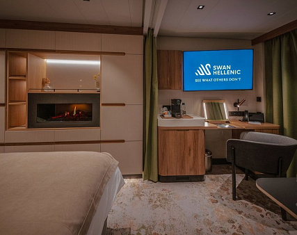 Благодаря наличию панорамного балкона 5 кв.м. каюта всегда наполнена светом. Зона спальни оснащена двуспальной кроватью, конвертируемой в две односпальные по запросу, и оборудована голографическим камином с эффектом живого пламени. Уютная зона гостиной располагает диваном и кофейным столиком. Завтрак на собственном балконе, отдых в зоне гостиной после насыщенного дня или послеобеденный сон – комфортное зонирование каюты позволяет гостям следовать собственным биологическим часам и не зависеть от планов своего спутника. Элегантная ванная комната оснащена душевой кабиной.