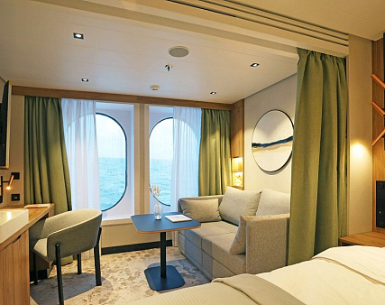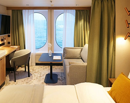 Каюты с окном: Площадь 20 м² с двумя большими панорамными окнами, зоной для отдыха и собственной ванной комнатой.
