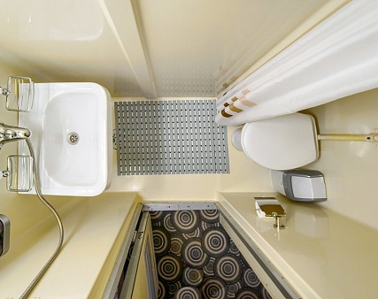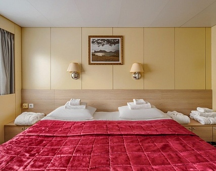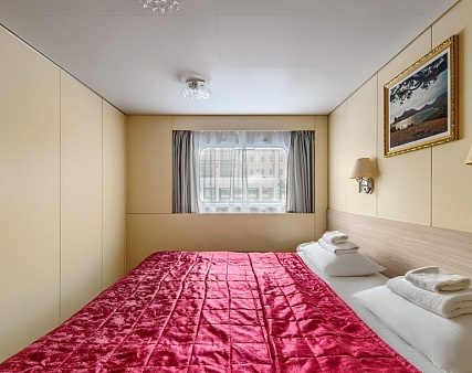 В каюте: четыре спальных места (два внизу, два вторым ярусом), шкаф для одежды, холодильник, радио, душ, санузел, кондиционер, два иллюминатора, электророзетка на 220V. Площадь каюты - 12,81 кв.м.