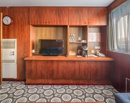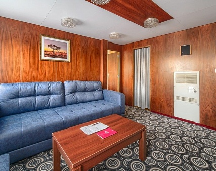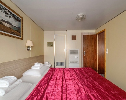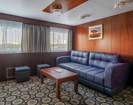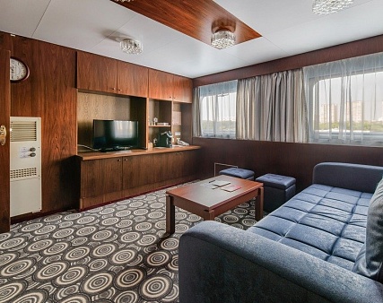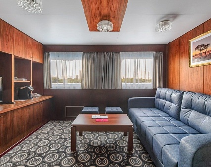 Двухкомнатная каюта с удобствами (душ, санузел, кондиционер). Каюта рассчитана на размещение двух человек ( возможно добавить два дополнительных платных места). В гостиной: мягкая мебель (диван), шкафы для одежды, телевизор, холодильник, радио, мини-кухня, два обзорных окна, электророзетка на 220V. В спальне: двуспальная кровать, обзорное окно.