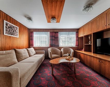 Площадь каюты 26,9 м2 (спальная комната - 9,7 м2, гостиная - 17,2 м2)