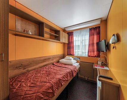 В каюте: одно спальное место, шкаф для одежды, холодильник, телевизор, фен, радио, душ, санузел, кондиционер, обзорное окно, электророзетка на 220V.