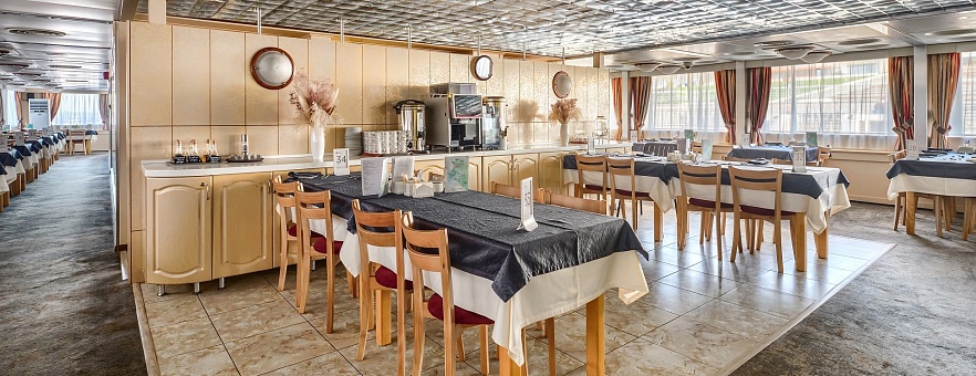 - Обед – заказная система питания (выбор блюд со 2-го дня круиза), фиксированная рассадка. Включённые напитки (без ограничения): вода, чай, кофе, морс.